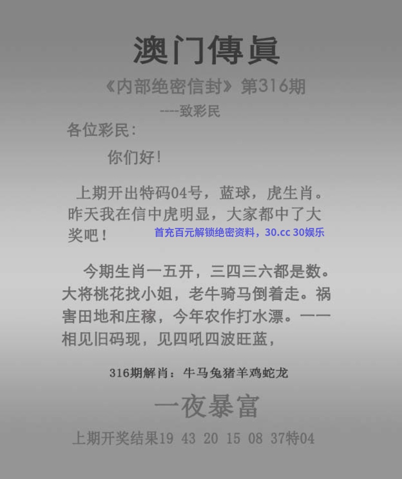 | 316期:独解传真 解:今期生肖一五开,三四三六都是数。大将桃花找小姐,老牛骑马倒着走。祸害田地和庄稼,今年农作打水漂。一一相见旧码现,见四吼四波旺蓝, 送:牛马兔猪羊鸡蛇龙 抓住一句解必中特 |